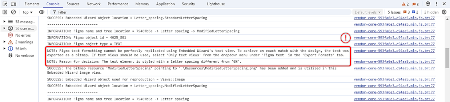 As mentioned earlier in this chapter, the Embedded Wizard Connect for Figma plugin outputs information for each Figma object during the export process. For clarification on why a text was not exported as a text view or appears different, additional details can be found in the console output: