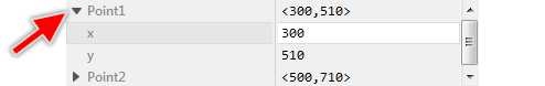 To inspect or modify the value of a Point1 attribute, select first the affected annotation arrow member. Thereupon, the attribute is listed in the middle area of Inspector. You can click on the small triangle left to the attribute in order to expand the subordinated x and y values: