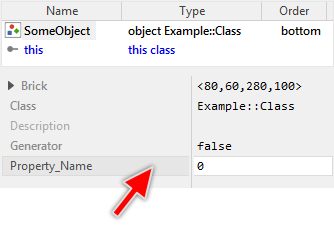 // This is a property containing a 'int32' value. Since there is no \ // value assigned to the property, the property is zero-initialized. // // $rect determines the position of the brick inside Composer window. // $category assigns this property to property group 'Counters'. $rect <10,10,210,50> $category Counters property int32 Counter; // This is a property intended to store a reference to a view object. \ // The property is initialized with a reference to the object 'Text'. // // $rect determines the position of the brick inside Composer window. // $output imposes the code generation of the property regardless of its \ // usage inside the project. $rect <10,10,210,50> $output true property Core::View MainView = Text; // This is a property inherited from a base class. Its data type is \ // determined in the base class and can't be changed in descending \ // classes. The property is re-initialized with a value 'false'. // // $rect determines the position of the brick inside Composer window. $rect <10,10,210,50> inherited property Selected = false;