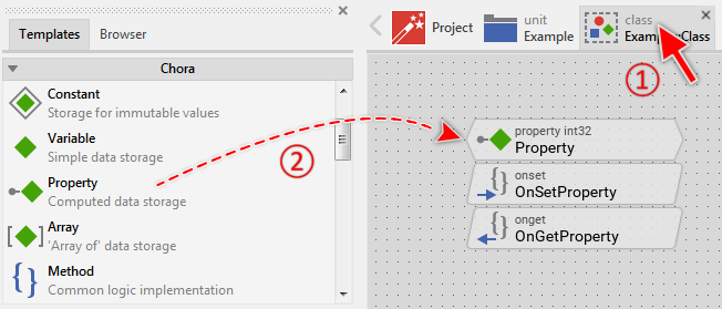 Once defined, the name of the property can be used within Chora expressions wherever an operand with the data type matching the properties declaration is expected. Moreover, a new value can be assigned to a property. Each access to a property causes its associated onget or onset method being called. Properties are always used in scope of the object, the property belongs to. If no scope is specified, the operation is considered as being performed in context of this object. For example: