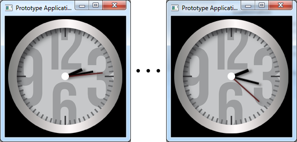 When you start the prototyping, Embedded Wizard opens the Prototyper window. You can imagine, this window represents the display in your final product. Now you can interact with the Prototyper by using the keyboard and the mouse device similarly as you will do with hardware buttons or touchscreen available in your product. If the component implements animations, the animations are executed accordingly, for example a clock is updated automatically: