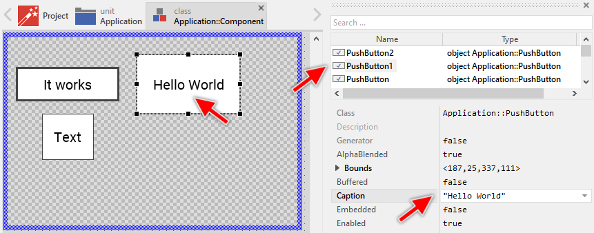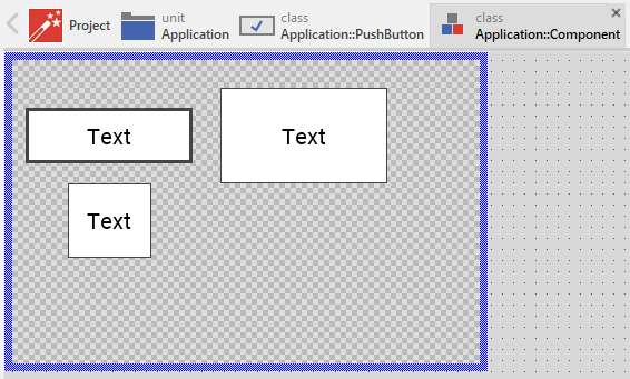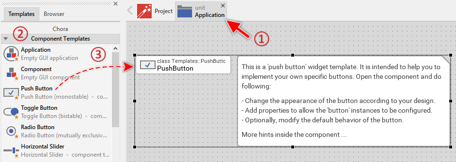 To create a new Push Button component from a template you simply Drag & Drop it between the Templates window and the Composer with an opened unit. This is important in that by using the component templates you add in fact a new class to your project. Classes, in turn, can exist within units only. The following are the typical steps to create a new Push Button component from a template: