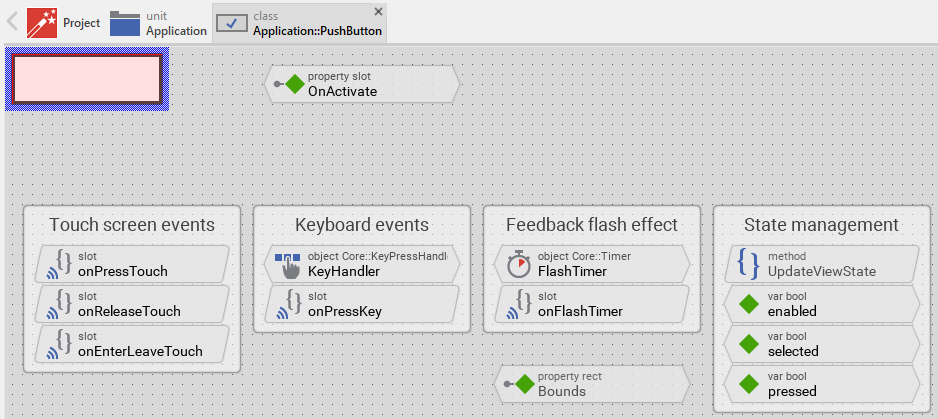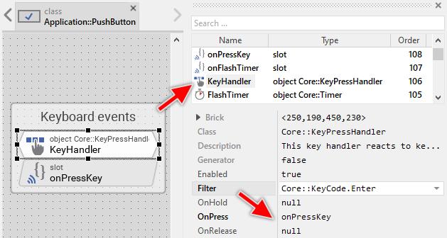 The Push Button is an interactive component. It can be controlled via keyboard or hardware buttons. For this purpose the template contains the Key Press Handler object named KeyHandler. To this handler is associated the slot method: onPressKey. This method is invoked when the user presses a key matching the filter condition specified in the KeyHandler object. This is per default the key Enter: