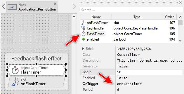 When the user touches the button or presses the associated key, the button changes its visual appearance to provide to the user a kind of feedback that the user successfully hit it. If the user taps the button very quickly, however, the time elapsed between the press and release events is possibly too short to highlight the button sufficiently and so provide the desired feedback. In such case the implementation responsible for handling touch and keyboard events triggers the timer object named FlashTimer. The timer prolongates thereupon the visual effect. As soon as the timer expires, it signals its associated slot method: onFlashTimer: