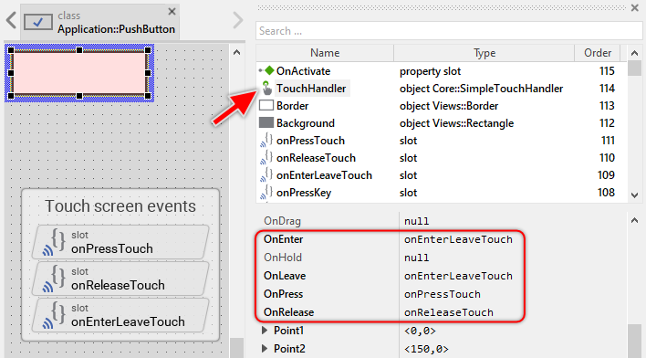 For example, the slot method onEnterLeaveTouch is associated to the TouchHandler and it is invoked when after touching the button the user drags the finger out of its area and again into its area. In response to this, the pressed state of the button has to be updated. The method onEnterLeaveTouch requests thus the invocation of UpdateViewState: