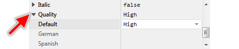 The attribute Quality can be localized allowing the creation of font resource members optimized to display multilingual text. For this purpose expand the attribute by clicking on the small triangle left to the attribute. All available language specific values are listed thereupon below the attribute and can be modified individually: