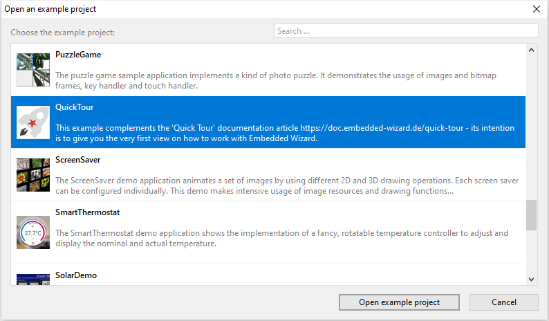 ★Then navigate to the subfolder Embedded Wizard 15\Examples\QuickTour. Please note, if the installed Embedded Wizard is newer than 15, you will have to navigate to the corresponding directory (e.g. Embedded Wizard 16).