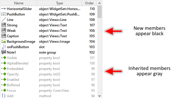 The Inspector, in turn, always displays all members. Those, which are inherited appear in Inspector in gray color. New members added to the actually-edited class appear black. In this manner, you can recognize the origin of a member easily.