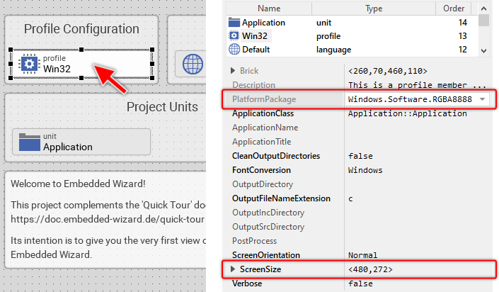 The Profile brick Win32 exposes, beside others, the attributes PlatformPackage and ScreenSize. As you see in the screenshot above, the attribute PlatformPackage is actually configured with the value Windows.Software.RGBA8888. This means, by using this profile, the Embedded Wizard will generate a code optimized for Microsoft Windows operating system (Windows) with RGBA8888 as a native color format for all images. Selecting another value in this attribute would allow you to generate code for other target systems or color formats.