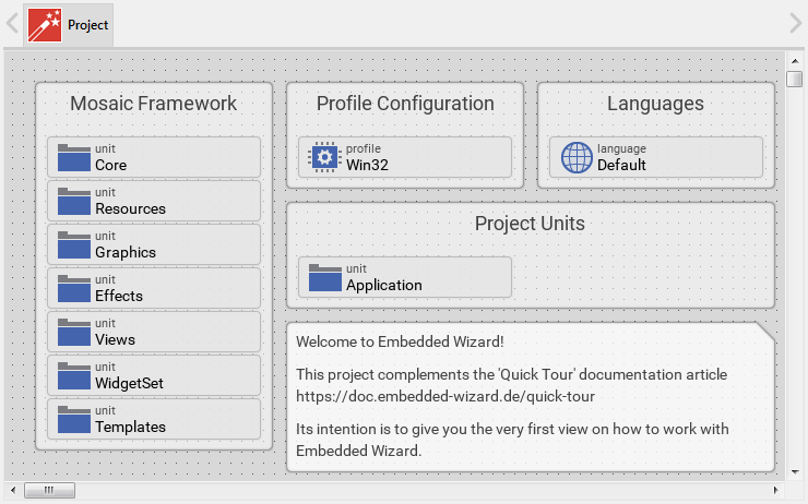 After you have opened the Quick Tour sample, you will see in the middle area of Embedded Wizard the so-called Composer - the main editor of Embedded wizard. Within the Composer you see many gray rectangles: