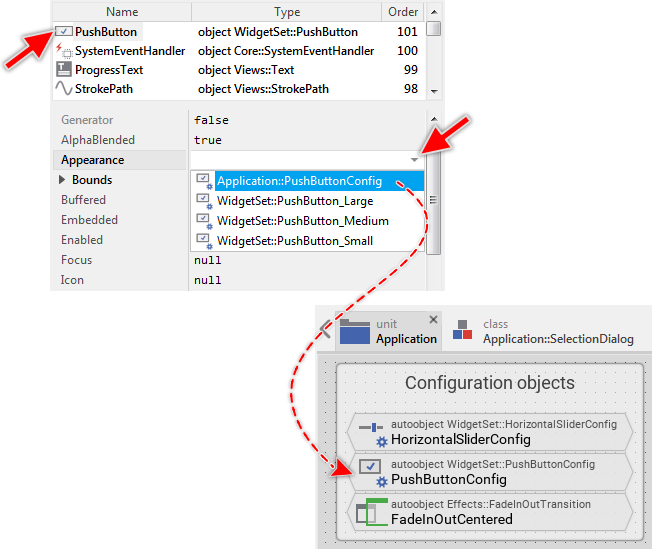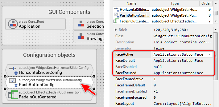 The class WidgetsSet::PushButtonConfig implements such non-visual configuration component. In the screenshot above, please note the four properties FaceActive, FaceDefault, FaceDisabled and FaceFocused. They determine the bitmap resources to display in push buttons using this configuration object. In other words, when you connect a push button with the configuration object PushButtonConfig, the push button will use the specified bitmap resources for its appearance.