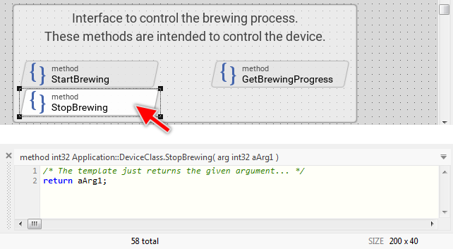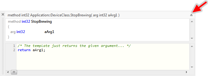 ★Within the Declaration area, single-click on the first row containing the return type of the method (the row with the text method int32 StopBrewing) in order to select the row (note: don't double click on it, just single click to select the row):