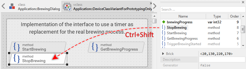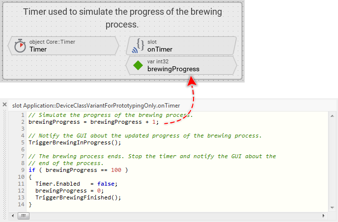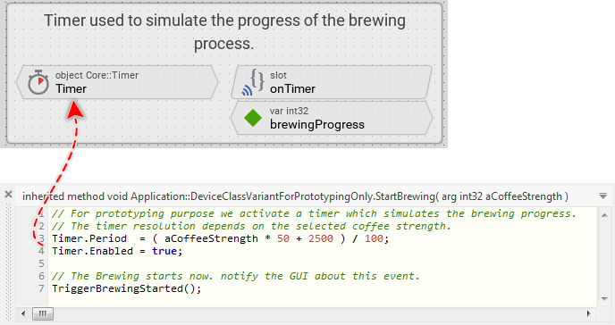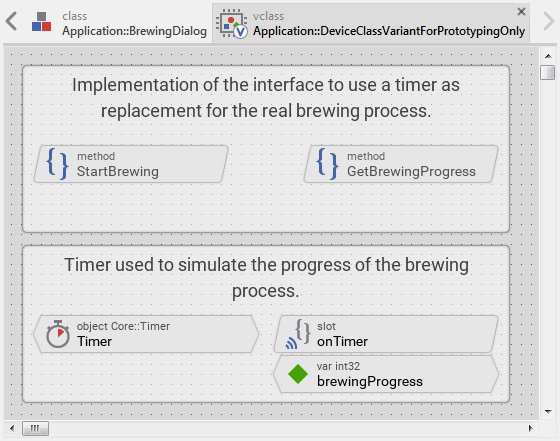 Thus if there is no real device available during the prototyping session, how is it possible to start the brewing process directly in the Prototyper window by simply pressing the play button? Well, the answer is simple: this behavior is simulated. The project contains for this purpose a separate implementation of the DeviceClass containing a timer to simulate the progress of the brewing process. This so-called class variant is used selectively during the prototyping session only and has no effect in the resulting application for the real device.