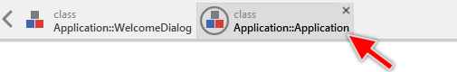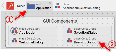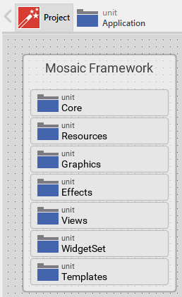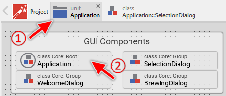 Thus the contents enclosed within the unit Application are revealed in a new Composer page. During the work with Embedded Wizard, you will often switch between the diverse Composer pages. All opened pages are listed as tabs in the Navigation bar at the upper edge of the Composer. Actually, you can see there the one tab representing the main Composer of the project and another associated to the just opened Application unit: