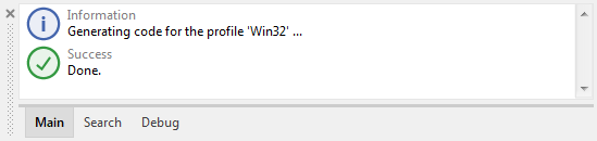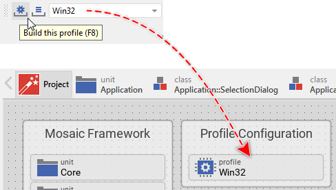 The code generation is performed according to configuration parameters specified in a profile member. You remember from the beginning of this article, there was a profile member named Win32 existing in the project. This profile was configured to generate code for Microsoft Win32 operating system as a target. As you can see from the combo-box on the right of the tool button , this exact profile Win32 is actually the selected one. In future, if you create GUI applications for different target systems, you can manage in your project several profile members. By selecting the right profile member in the combo-box, you determine the rules for code generation and for the prototyping.
