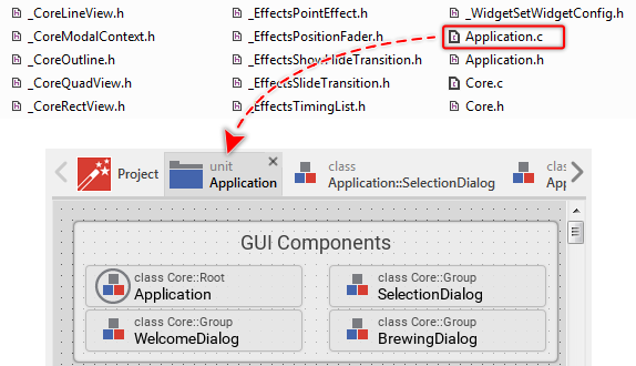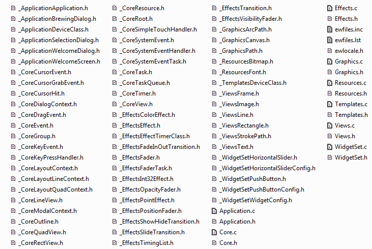 Within the Win32 folder, you will see many C header and code files (*.h and *.c). Every *.c file corresponds to the homonymous unit. For example, in our project, there is a unit Application containing all GUI components, resources and members of the interface that connects GUI with the device. The contents from this unit and the contents in the generated file Application.c thus correlate as: