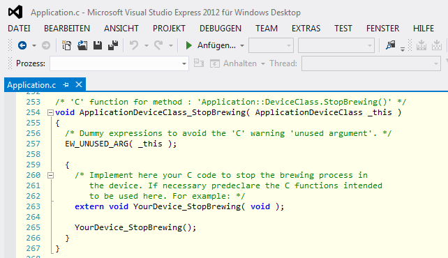 The C function ApplicationDeviceClass_StopBrewing() corresponds to the method StopBrewing that you have implemented within the class Application::DeviceClass in one of the preceding steps. As you remember, this method contained some native code that triggers the device to stop the active brewing process. This code is found within the corresponding C function ApplicationDeviceClass_StopBrewing().