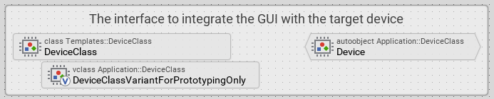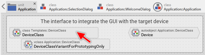 From the upper text row in the brick, you will see that the brick represents a variant of the class Application::DeviceClass (the member type is vclass). This means that the implementation contained within the vclass will enhance, override or even replace the implementation found in the original class. Wherever the original class is used, the modified implementation from the vclass is also taken into account. An object instantiated from the original class behaves in praxis as if it would be an instance of the variant class.