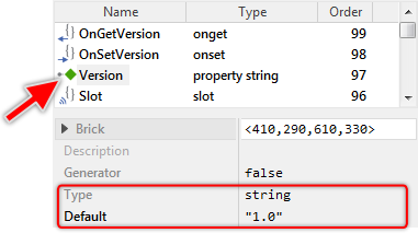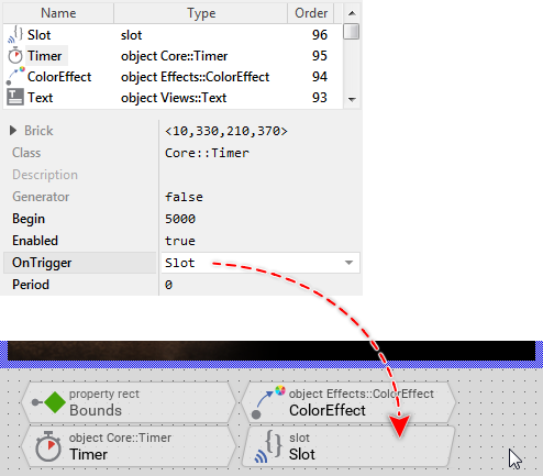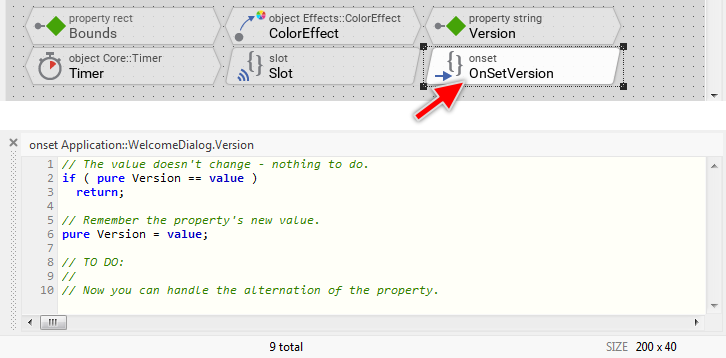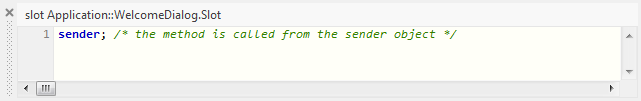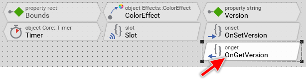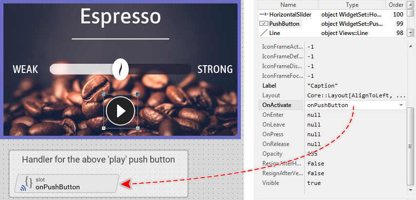 As you see from the screenshot above, the button's property OnActivate is actually initialized with the expression onPushButton. This expression, in turn, addresses the homonymous brick - a so-called slot method. At the runtime, when the push button is activated, the button will send a signal to the associated slot method and trigger so its execution. The slot method thus serves as a functioning entity, which can be recognized by the beveled edges of the corresponding brick.