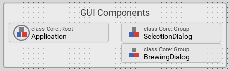 These three bricks are classes implementing (visual) GUI components. For example, the brick SelectionDialog implements a screen (we call it dialog) where the user can select the desired strength of the coffee to prepare. The brick BrewingDialog, in turn, implements a dialog showing the progress of the brewing process.