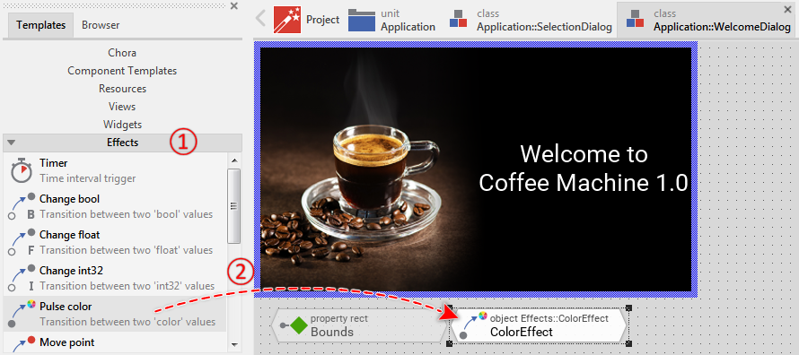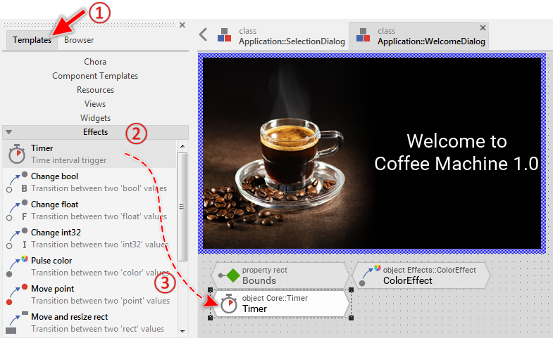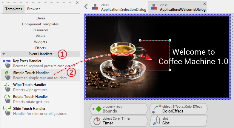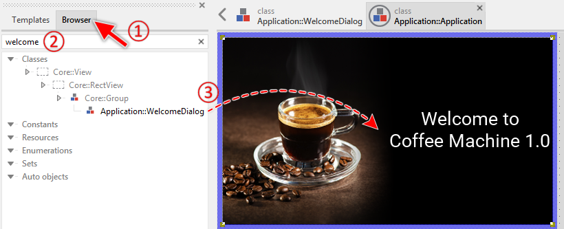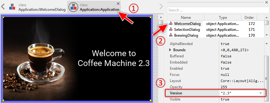 To facilitate your entry into the new technology, we have prepared a small project called Quick Tour. This project implements the GUI for a simple coffee machine. Through the GUI, the user can select how strong the coffee should be brewed and start the brewing process. Nothing more. Very straightforward.