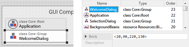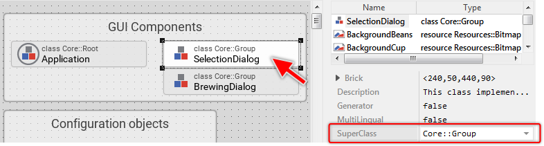 Most especially, take note of the attribute SuperClass of the just selected brick. It is actually initialized with the expression Core::Group (by the way, the same value is also displayed in the upper text row of the brick). This expressions indicates, that the class SelectionDialog descends from another class Core::Group. This super class, in turn, is implemented in the Mosaic framework (the basement of every GUI application) we have explained shortly before.