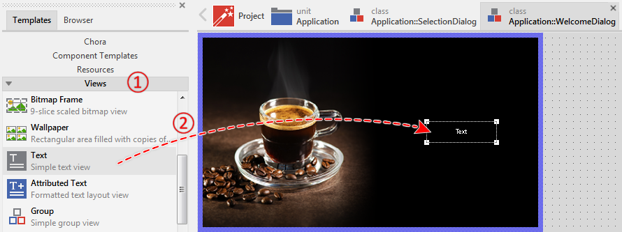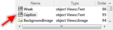 After being selected, the text appears surrounded by a thin-dotted border. The corners of the border appear as small quadrates. With this so-called selection frame, you can move and resize the text. Simultaneously, the Inspector highlights the corresponding member Caption as selected and you will see, that the text is an object of the Mosaic class Views::Text. It is a view - a primitive visual component: