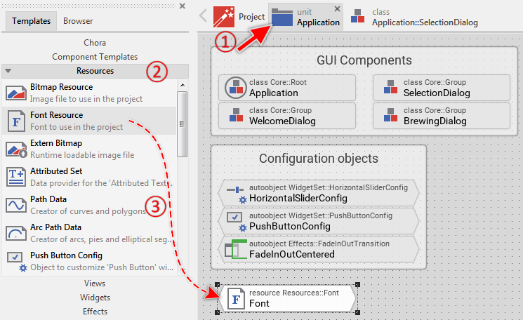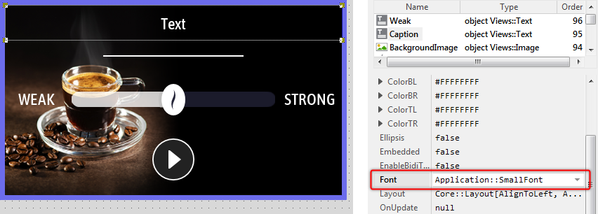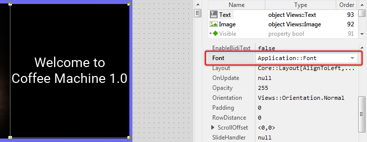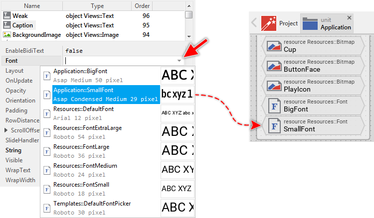 While we analyzed the contents of the unit Application you saw there the brick SmallFont. The function of this member was to store font information. Now, you will see exact this member listed in the Assistant window. Since the corresponding item is highlighted, the text view is actually using this font. In other words, the text you see in Canvas is drawn with this font. Now, let's assume that this is not the font we want to use for the caption. The caption should appear with the bigger font Application::BigFont. For this purpose: