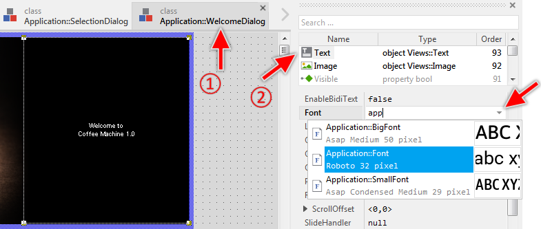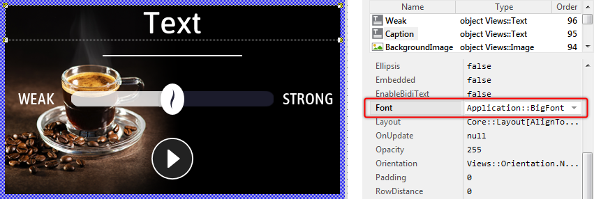 ★In the Assistant window, double-click on the item Application::BigFont to select it. Thereupon the new font name appears in the property Font and the size of the text displayed in the Canvas area changes. The text is big enough now: