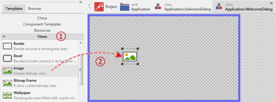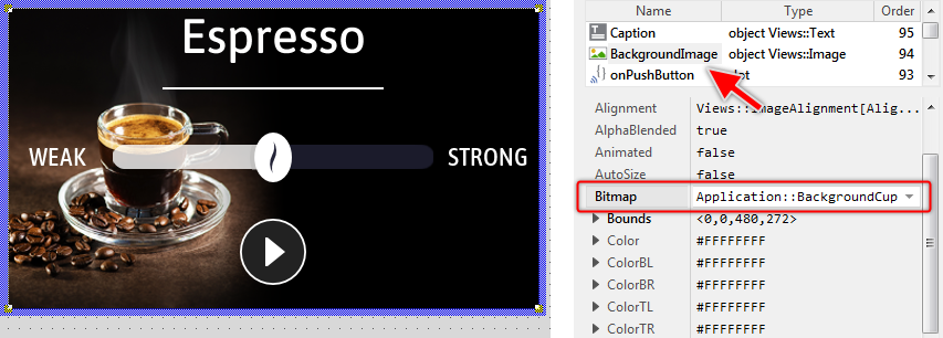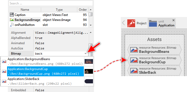 The image view (as you can deduce from its name) is intended to display images. As we analyzed the contents of the unit Application, we explained the brick BackgroundBeans. The function of this member was to store image information. Now, you see this member listed in the Assistant window. The image view, however, is actually using the bitmap resource Application::BackgroundCup, which is not what we expect here. We want the image to display the bitmap resource BackgroundBeans. For this purpose: