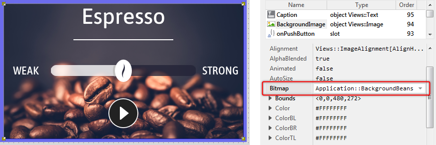 ★In the Assistant window, double-click on the item Application::BackgroundBeans to select it as a new resource for the image view. Thereupon the new bitmap name appears in the property Bitmap and the image displayed in the Canvas area changes. Instead of the cup, you see coffee beans: