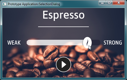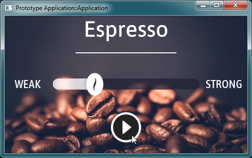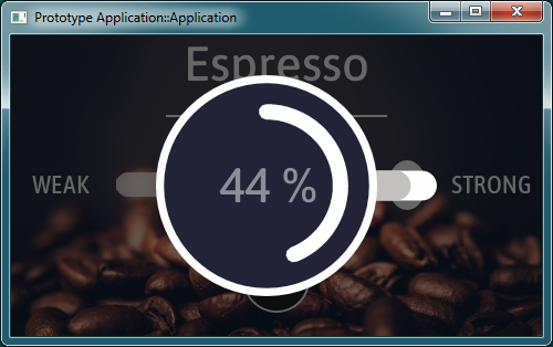 Now, the Prototyper is loaded with the entire GUI application. Accordingly, pressing the play button as well as have an effect. It starts the brewing process. You will see a new GUI component overlapping the component in the background. The new component displays a round progress bar enclosed inside an image of a stylized coffee cup. When the brewing process is done, the overlapping component disappears automatically, restoring the visual state of the underlying SelectionDialog component. Every time you activate the push button, this operation repeats: