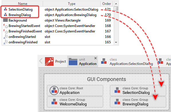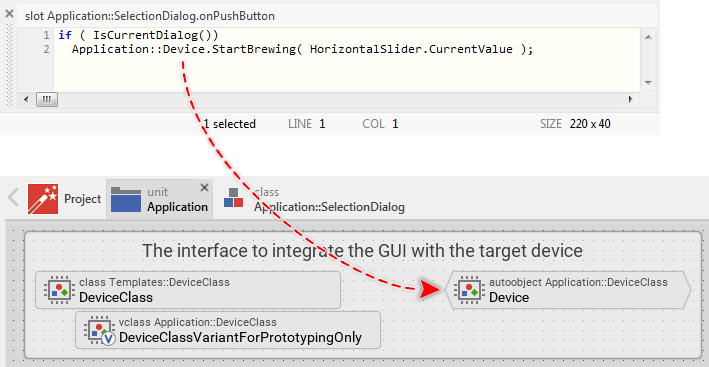 The slot method, after successfully evaluating an if-condition, invokes a method (in the language C, you would say function) named StartBrewing. The method is invoked in the context of a global object (an autoobject) Device existing within the unit Application. As you remember, at the beginning of the article, we have explained that the object Device, as well as the both accompanying bricks (e.g. DeviceClass), build the interface to the underlying device.