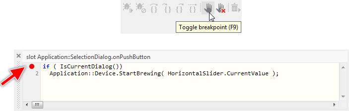★Then in the upper area of Embedded Wizard window, click on the tool button to set a breakpoint at the just clicked code row in Code Editor. You can also use the shortcut F9 to achieve the same effect. The breakpoint is indicated by a red circle directly on the left of the affected code row: