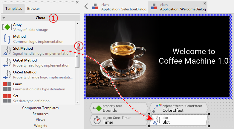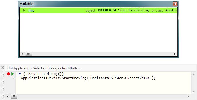 According to this modification, when the user presses the stop button, the slot method is triggered and StopBrewing() is invoked. The expression Application::Device on the left of the invoked method addresses an autoobject (a global instance of Application::DeviceClass). The method is thus invoked in context of this object.