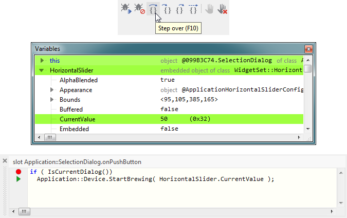 As in other development systems, when you program an error, the application will not work as expected. To help you to find the cause of the problem, Embedded Wizard integrates a debugger environment. With it, you can set breakpoints, step through the code, inspect the call stack, variables and objects directly while you test the application in the Prototyper window. Please try the following:
