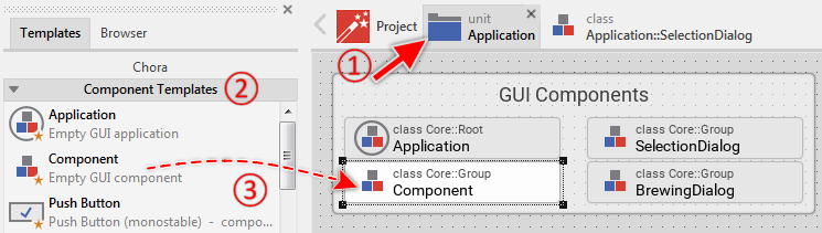 Depending on the type of project member, the corresponding brick may contain further embedded members. You can reveal them by simply double-clicking on the member - similarly to how you open a folder in Windows File Explorer. Please take a look at the brick named Application. Bricks of this type represent in the project the so-called units. The unit is where you put your concrete implementation - analog to a *.cpp file in a C++ development system.