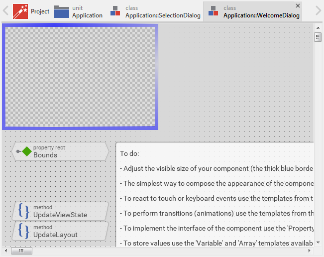 The contents of the class SelectionDialog appear in a new Composer page. This Composer, however, is something different. In the top-left corner, you will see an area surrounded by a thick blue border. This area is called Canvas. What you see within this area will also be visible on the display in your target device. The Canvas area is available only when the actually-edited class does represent a visual GUI component.
