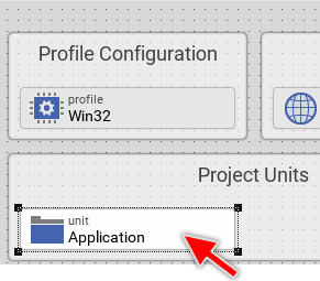 The small rectangles are called bricks. Every brick represents an individual member within the project. The shape of the brick, its icon and the text at its upper edge describe the exact function of this brick. For example, the brick named Win32 represents the profile member - a member needed to configure general project and target specific parameters: