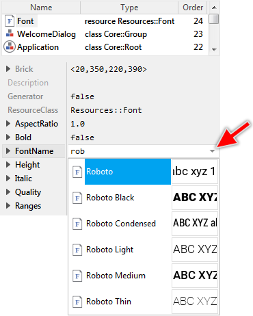 Assistant windows are convenient tools to easily select the adequate value when modifying a property or attribute. While working with Embedded Wizard, you will use them very often. In this concrete case, the Assistant from the screenshot above is intended to list all font resources existing actually in the project.