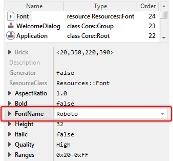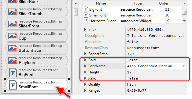 The just selected brick SmallFont represents a font resource. As you see in Inspector, the font resource is configured with the font name Asap Condensed Medium and the font size of 29 pixel. Again, when generating code, Embedded Wizard will automatically convert the specified font in a format that is appropriate for the target system. This usually includes the rasterization and compression of all affected font glyphs. Later, when you want to display text with this font, you can simply refer to the member SmallFont.