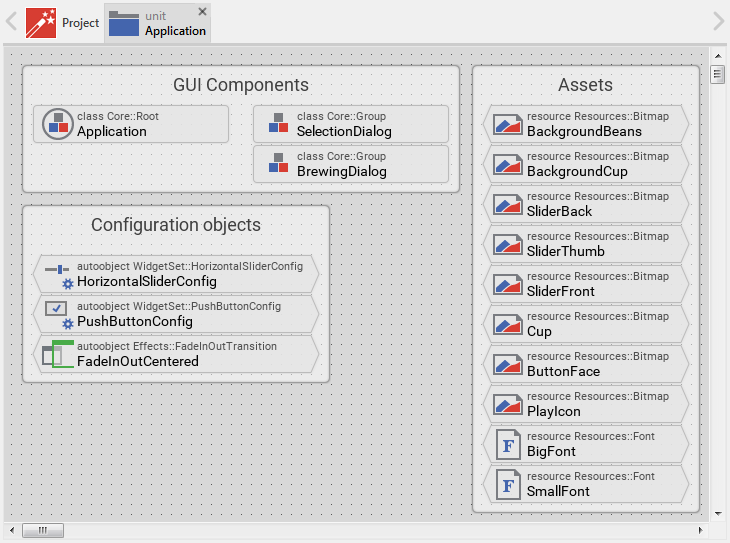 Besides the above-mentioned bitmap and font resources, you can see the unit containing a few other bricks. Please take a look at the three bricks grouped together below the annotation Configuration objects. These bricks represent the so-called autoobjects (global objects) containing diverse settings that are important for the GUI application. Since an object is a data entity, the bricks are also shown with pointed edges: