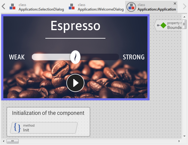 In our tutorial example, this GUI component permits the user to select the desired coffee strength and to start the brewing process. Typically, complex GUI projects will consist of many different GUI components, which depending on the user interaction appear and disappear on the display. The SelectionDialog component implements, thus just one of the GUI components.