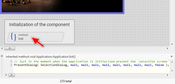 ★Double-click on the brick onPushButton to reveal its content. Unlike the bricks you learned before, the content of a slot method is shown in the Code Editor in the bottom-right area of Embedded Wizard window: