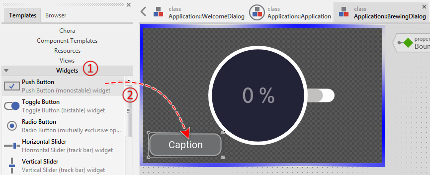 ★Once back in the Composer of the BrewingDialog, make sure that the previously added push button is still selected.