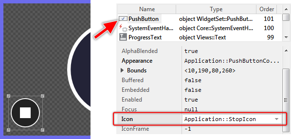 ★In the Inspector, change the button's property Icon to the name of our new bitmap resource Application::StopIcon. The button changes immediately the appearance showing now the stop icon: