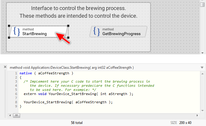 This means in praxis that, in the application running on the device every execution of the method StartBrewing will call the enclosed C function. The selection screen, in turn, implements code to invoke the method StartBrewing every time the user touches the enclosed play push button. In other words, the activation of the push button invokes the StartBrewing method, which on its part calls the C function to initiate the brewing process.
