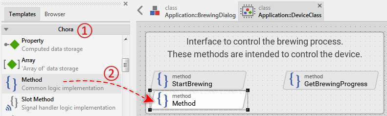 The brick DeviceClass implements a class serving as the interface to the device. As you see in the screenshot below, this interface actually consists of a few methods. In particular, the first annotation encloses the methods to start the brewing process and to query its actual status. These methods are thus used from the GUI to trigger some operations in the device. In turn, the bricks enclosed within the second annotation are intended to be used by the device to send notifications important for the GUI: