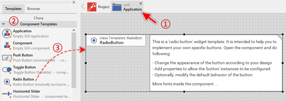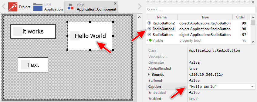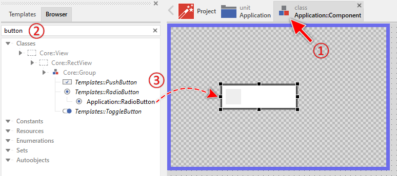To create a new Radio Button component from a template you simply Drag & Drop it between the Templates window and the Composer with an opened unit. This is important in that by using the component templates you add in fact a new class to your project. Classes, in turn, can exist within units only. The following are the typical steps to create a new Radio Button component from a template:
