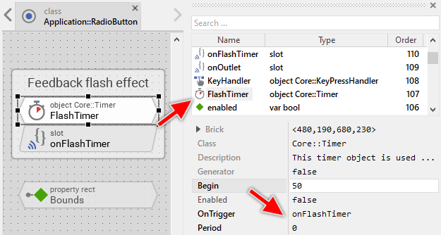 When the user touches the button or presses the associated key, the button changes its visual appearance to provide to the user a kind of feedback that the user successfully hit it. If the user taps the button very quickly, however, the time elapsed between the press and release events is possibly too short to highlight the button sufficiently and so provide the desired feedback. In such case the implementation responsible for handling touch and keyboard events triggers the timer object named FlashTimer. The timer prolongates thereupon the visual effect. As soon as the timer expires, it signals its associated slot method: onFlashTimer: